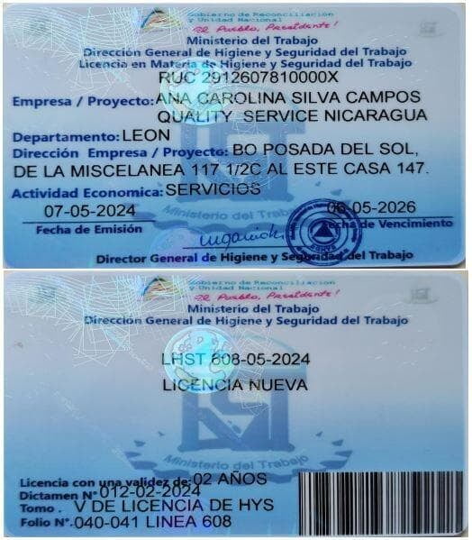 Contamos con la Licencia en Materia de Higiene y Seguridad del Trabajo otorgada por el Ministerio del Trabajo de Nicaragua, vigente hasta mayo de 2026, lo que garantiza que nuestros procesos cumplen con todas las normativas aplicables en el sector.